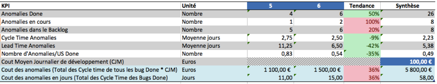 - Le temps moyen (Cycle Time) nécessaire à la correction d’une anomalie ;